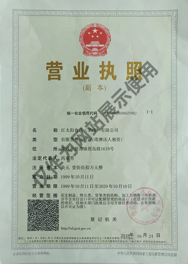 红太阳食品(荣成)有限公司始建于1999年,是一家专业从事花生及其它果仁系列休闲食品的加工、研发及销售的外向型、区域骨干型绿色有机食品生产企业,是目前国内花生制品行业中生产品种较全、品质较佳的企业之一。目前公司有4个...
